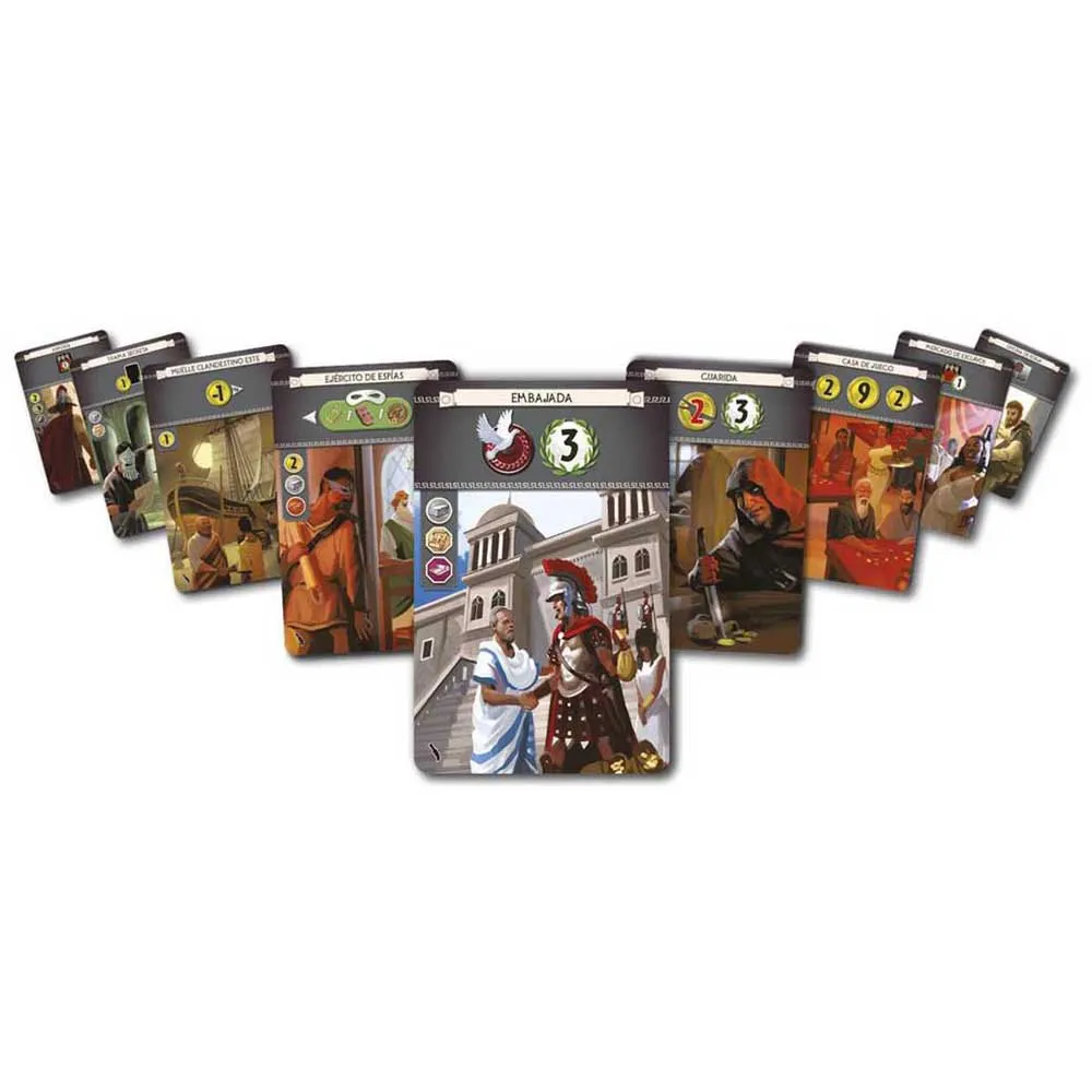 Content 2 Wonder Boards 42 Letters 26 debt chips 3 chips Diplomacy 6 coins 1 booklet scoring 3 sheets of New Effect Description and 1 Regulations.