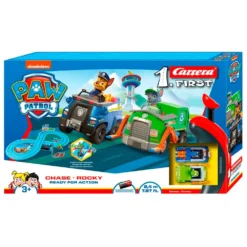It has a button on the chassis that allows you to turn the lights on or off, which flash to simulate fire alarms (works with 2 AA batteries not included), and its plastic wheels includes rubber bands to improve grip on the road when travelling.
