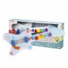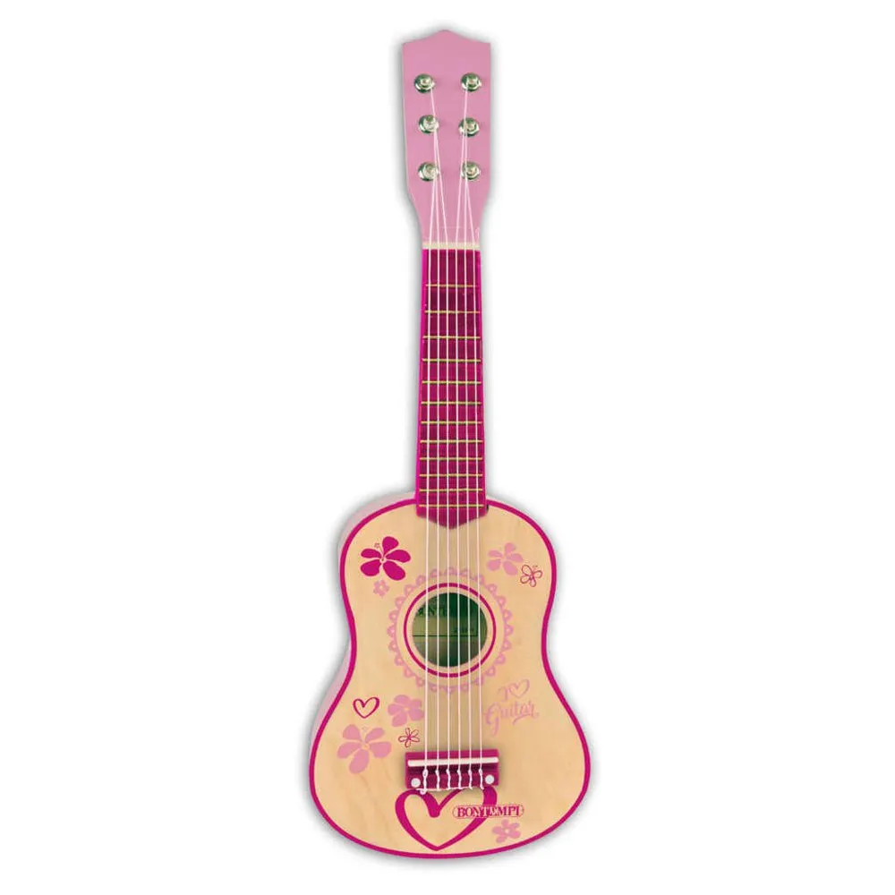 Are you looking for a toy instrument for you little kid? The kids´ wooden guitar with 6 strings from Bontempi is a perfect choice for you. This wooden guitar is specially designed for kids and is delivered complete with manual, plectrum and sheet music. Even if your child is not yet able to play good notes, grabbing the strings and hearing the realistic sounds encourages children to get to know how to play on a guitar and it will absolutely catch their attention. Additionally, the toy guitar with 6 strings can be easily tuned by turning the tuning knobs. Encourage your kid to play an instrument which can develop their interest in music and beautiful sounds, then a little music talent is born! Colour: Pink, red and brown Material: Wood Dimension: 55 x 18,1 x 6,5 cm (L x W x H) Tunable by tuning knobs Realistic sound Extensive manual with sheet music and a plectrum included A box with handle included 1.WARNING: Not suitable for children under 36 months.