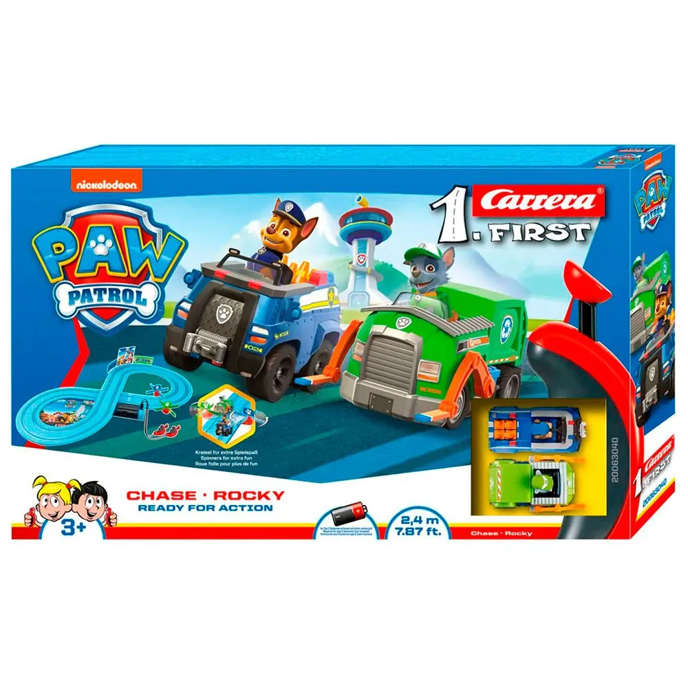 In the new Carrera FIRST ´´PAW Patrol – Ready for action´´ set the smallest racing drivers start from 3 years in exciting adventures with the popular dogs from the series PAW Patrol. Here, police dog Chase is breaking new experiences in his blue police car and repair specialist Rocky in his green recycling truck. Together they ensure safety and cleanliness in the children´s rooms at home.