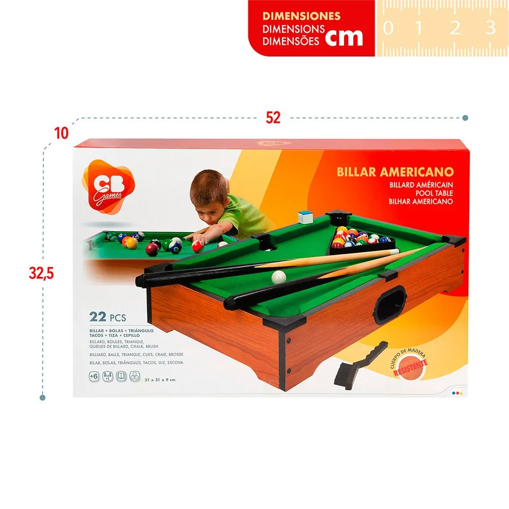 The game is equipped with 22 pieces:1 portable board of 51x31x9 cm, 1 triangle, 2 sticks of 48 cm, 15 balls, 1 cue and 1 brush.
