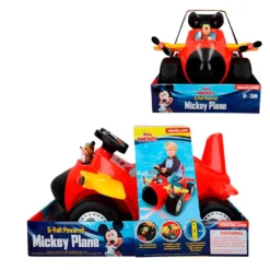 Guaranteed fun with Mickeys interactive plane! It works with 6V battery (includes charger) or 3 AA batteries (included)For children from 18 to 36 months with a maximum weight of 22kgIt is switched on and off with a button, advances by pressing the pedal and rotates 180ºIts propellers move and light upIt incorporates a game panel with lights and sounds and a Mickey doll that talks when pressed.