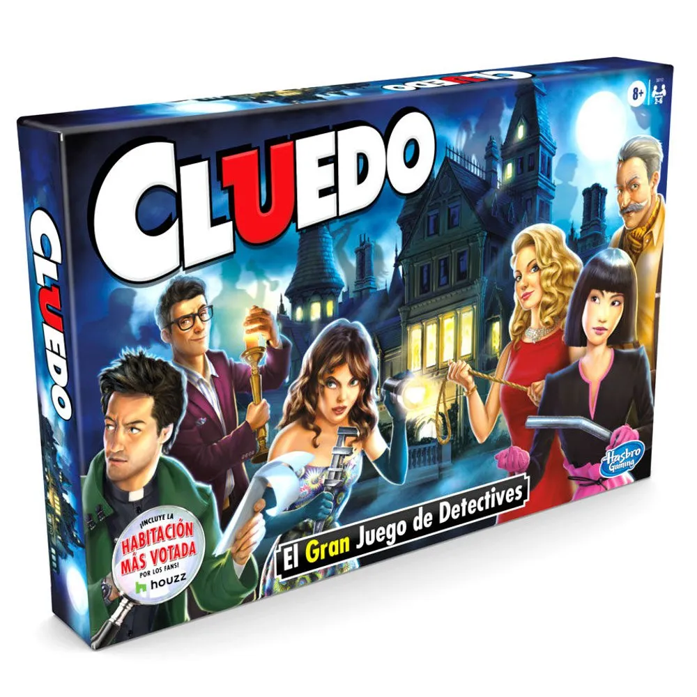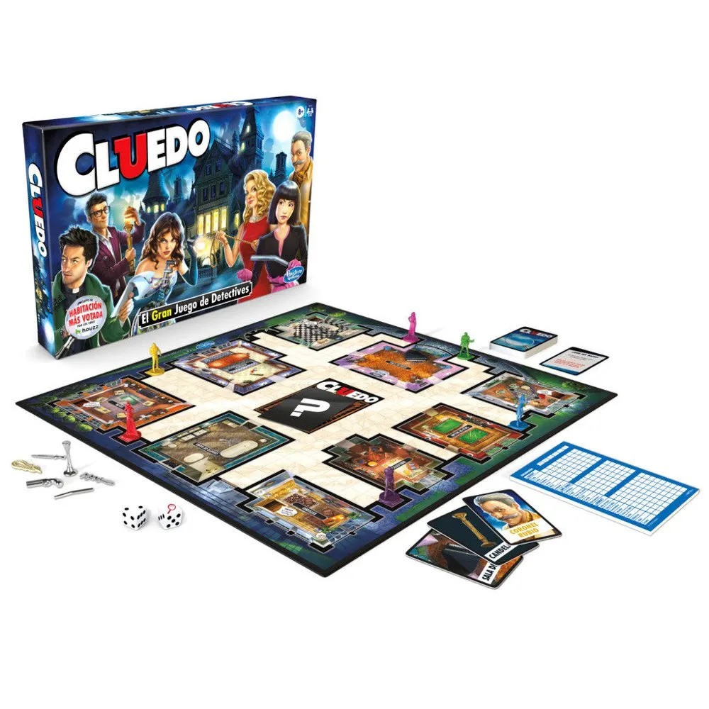 Spanish Includes mansion board, a yellow case envelope, a detective notepad, six character pawns, 21 black CLUEDO cards, 13 red Bonus cards, six miniature weapons, two dice and instructions.