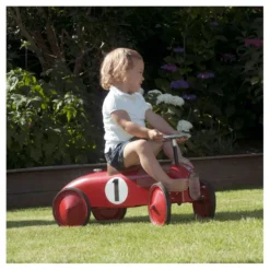 This beautiful Retro Roller James car in red is styled after Formula 1 racecars. The car is equipped with metal wheels, rubber tires and a plastic seat.