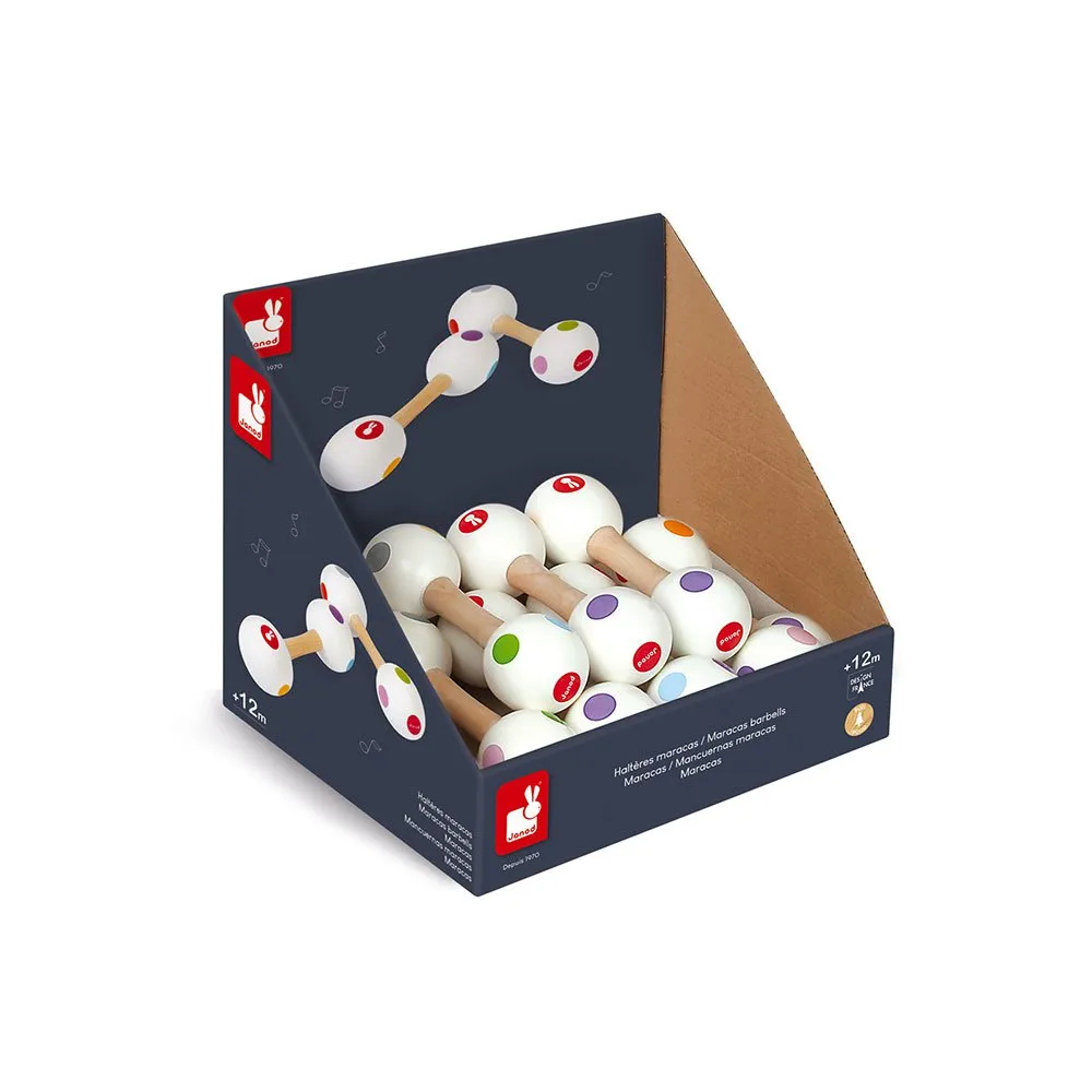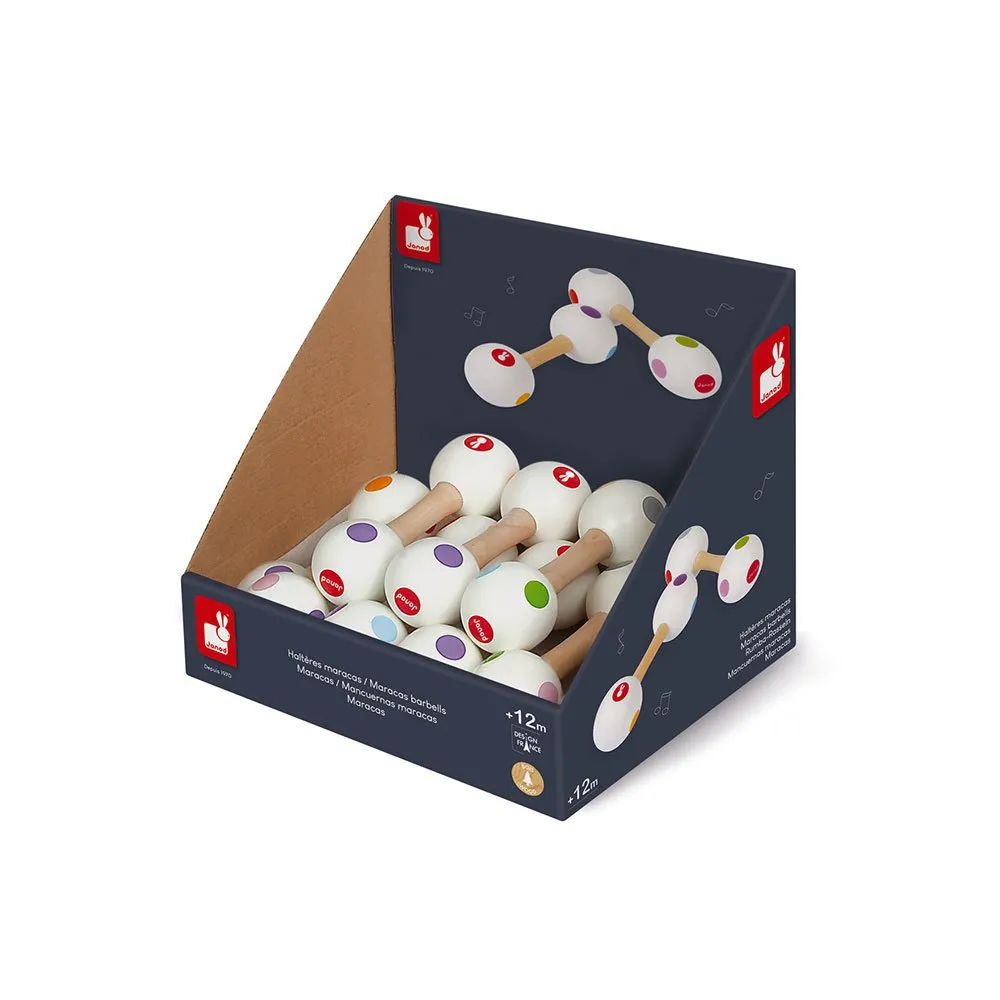 Wood Confetti Maracas Barbells, easy to handle and sold by 12 in a display.