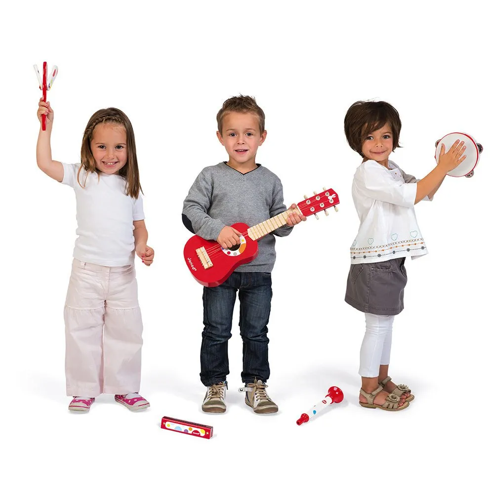 1 tambourine with cymbals (15 x 15 x 4,5 cm – 5.9 x 5.9 x 1.8 in) 1 guitar (53,5 x 6 x 17,5 cm – 21 x 2.3 x 6.9 in) 1 harmonica (13 x 2 x 2,5 cm – 5.1 x 0.8 x 1 in) 1 trumpet (18 x 5 x 5 cm – 7.1 x 2 x 2 in) 1 clapper (20 x 3 x 4.5 cm – 7.9 x 1.2 x 1.8 in) Closed colour box.