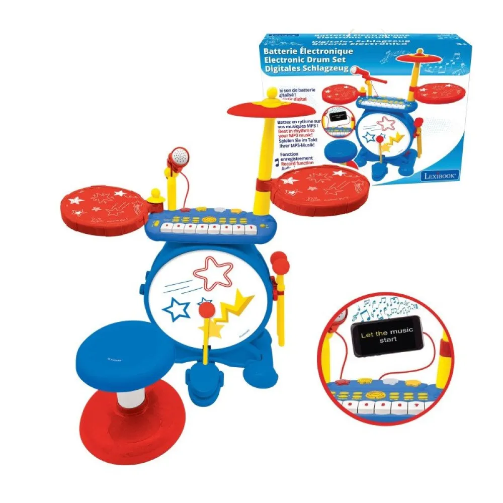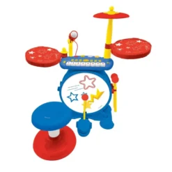 Become a rock star with this 3 in 1 battery! The child can play the piano, the drums and sing all their favorite songs! A complete drum set to keep up with a bass drum, two snare drums and a musical cymbal.