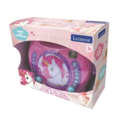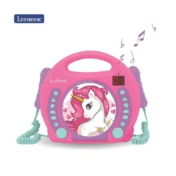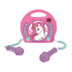 CD player with microphones 2 microphones included so you can sing with your favorite characters LED screen Very practical, with a handle so you can take it with you wherever you want! Headphone jack Snooze function Battery operated WARNING! Not suitable for children under 3 years of age.