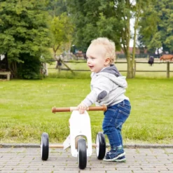 The mini tricycle Charlie from Pinolino is a great way to allow your kids to develop their balance skills! This kid´s tricycle has adjustable saddle that can be set in 6 stages, is made of clear and red lacquered solid wood. The cool wooden mini tricycle can be converted to a balance training bike with ease, and balance and coordination are trained without any training wheels! Thanks to the stable construction, kids can enjoy their happy riding without safety concerns! Colour: White Material: Birch Dimension: 66 x 41 x 37 cm (L x W x H) With 3 plastic tires Doubles as balance training bike Adjustable seat in 6 stages: 23 cm to 25 cm, 27 cm, 26 cm to 28 cm, 30 cm Recommended age: From 1,5 to 3 years 5.WARNING: Protective equipment should be worn. Not to be used in traffic.