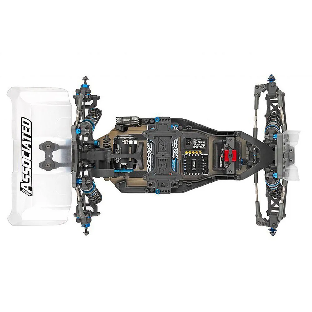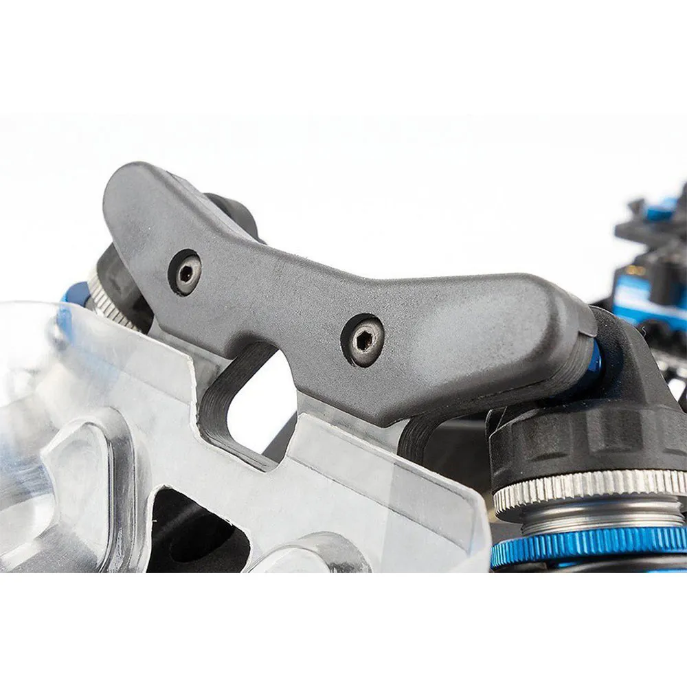 an integrated transponder mount, +4mm shock rod ends, tie-rod battery brace hardware and linkage included, 2-wire and 3-wire containing clips, rear shock tower guards, and a redesigned smooth front shock tower to cover the exposed screw heads.