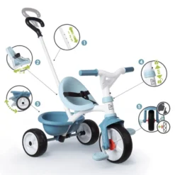 The 2-in1 blue Be Move baby tricycle from Smoby is a colourful kids ride on toy that will surprise your child from 15 months to 3 years and more. This kids tricycle accompanies you on all your walks. Thanks to the 3-position adjustable push stick (up to 95 cm), the freewheel system and the steering lock, you can easily steer the tricycle in the direction you want without your child bothering you. Your little one is comfortable in its enveloping and ergonomic chair, which you can adjust in 2 positions. Colour: Blue Material: Plastic and metal Dimensions: 68 x 52 x 52 cm (L x W x H) 3-position adjustable push stick (up to 95 cm) With freewheel system Steering lock Ergonomic chair Chairs adjustable in 2 positions Recommended age: From 15 months