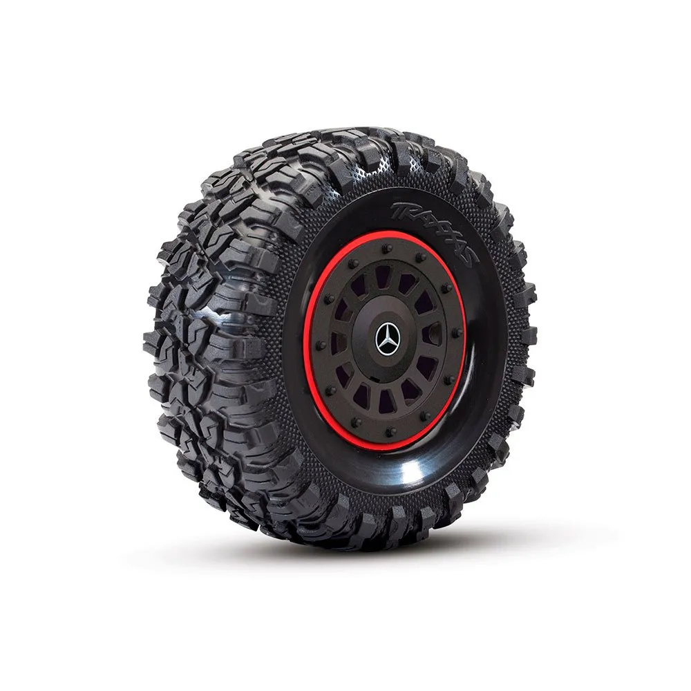 2ยดยด beadlock-style wheels with contrasting red trim and detailed center caps ride on specially designed all-terrain tires.